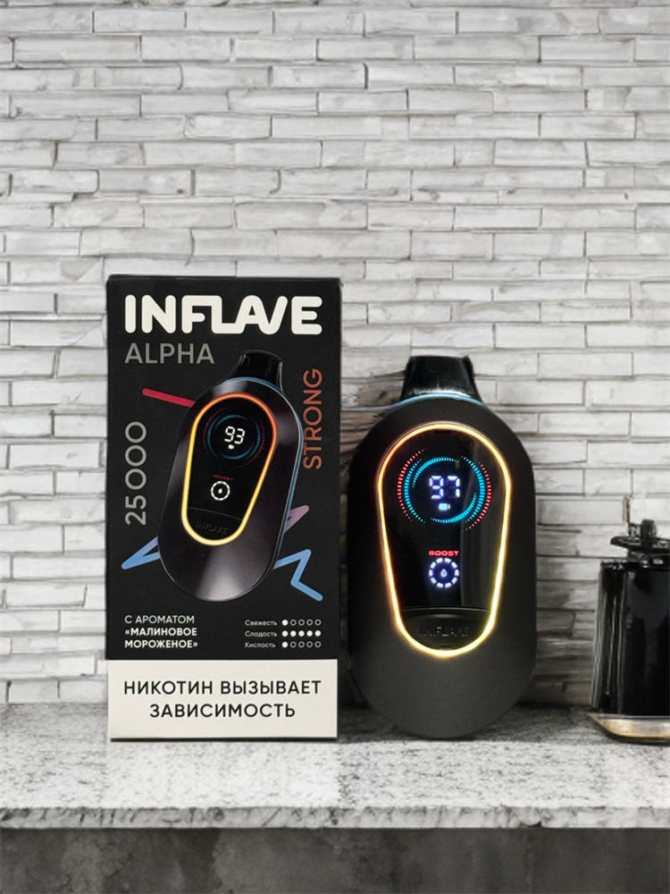 Купить одноразовые электронные сигареты Inflave Alpha 25000 на 25000 затяжек с подзарядкой Type-C и индикаторами оставшегося заряда и оставшейся жидкости, регулировкой мощности с доставкой или самовывозом из вейп шопов в Москве и доставкой по России.