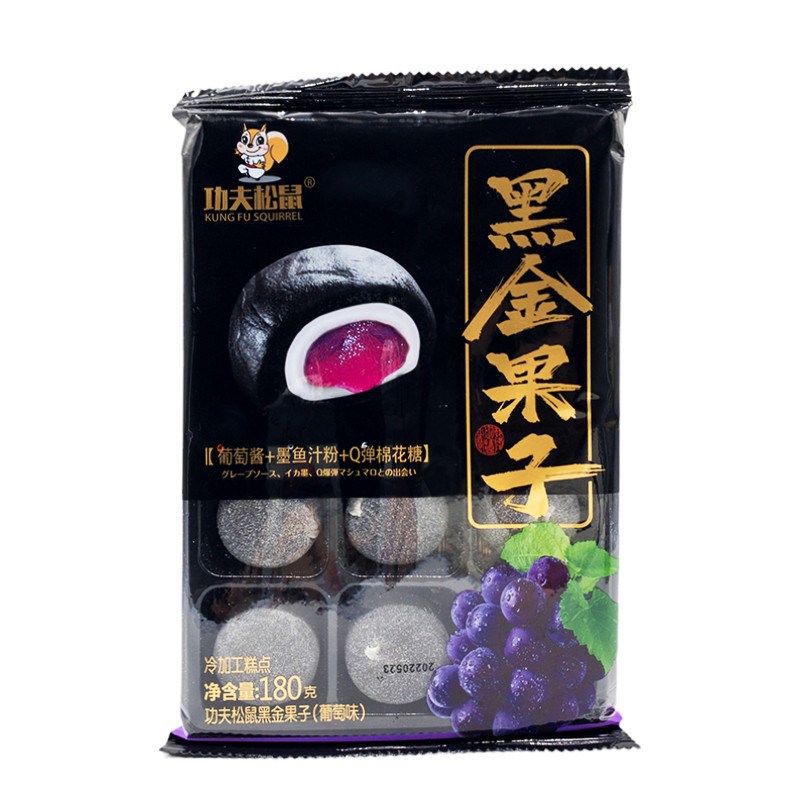 Состав: мальтозный сироп, крахмал, виноградный соус, клейкий рис, зефир, питьевая вода, белый сахар, порошок сока каракатицы (сок каракатицы, гуммиарабик, мальтодекстрин), гидрогенизированное кокосовое масло (содержащее сорбат калия), пищевые добавки (жидкий сорбит, альгинат натрия, моностеарат глицерина, DL-яблочная кислота, дегидроацетат натрия), пищевой ароматизатор.